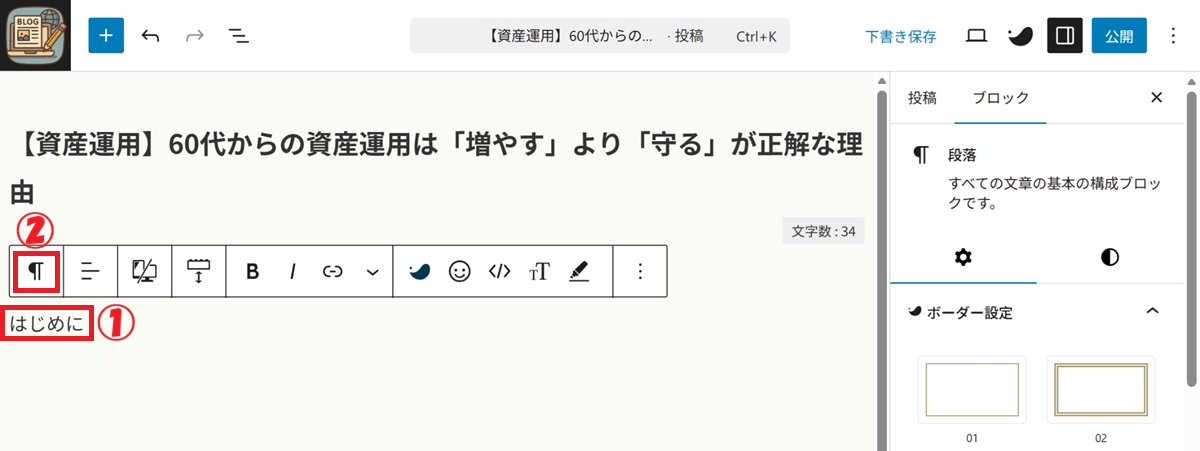 ② 段落アイコンをクリック