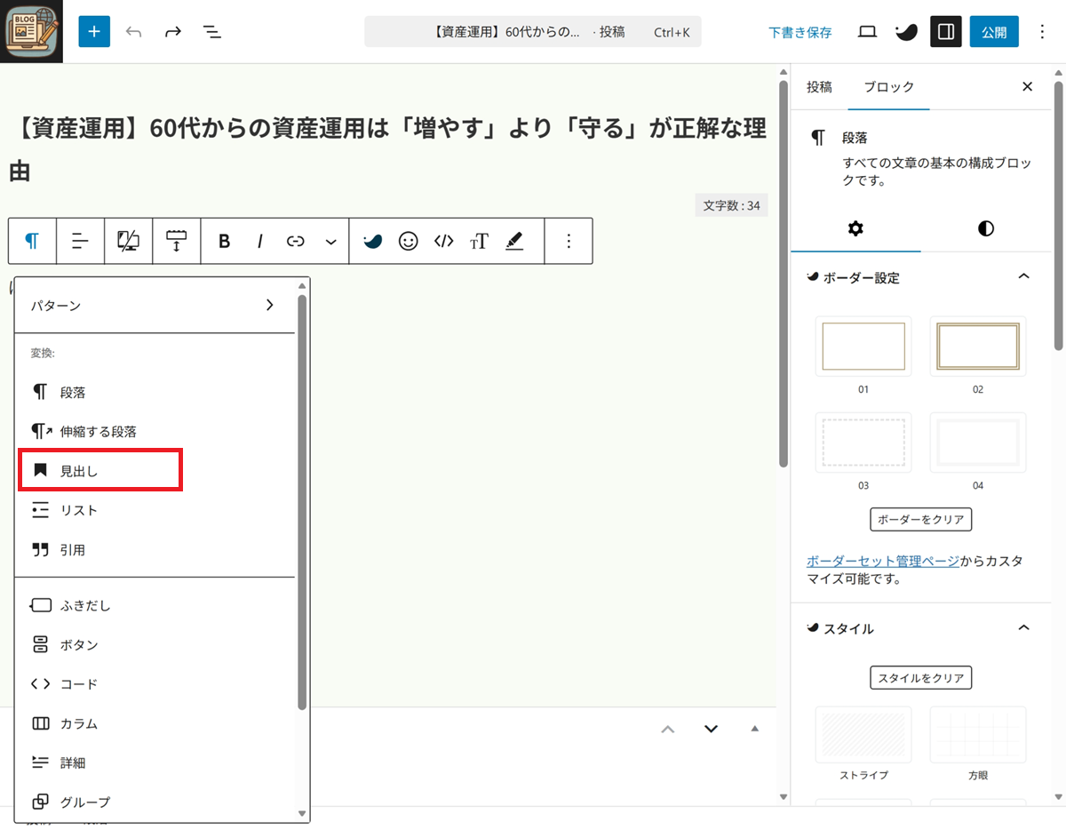 「見出し」をクリック
