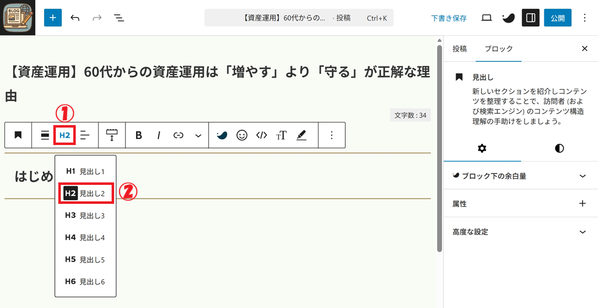 ② 見出しを選択(H2またはH3を選択。今回はH2をクリック)