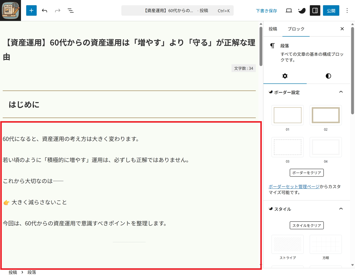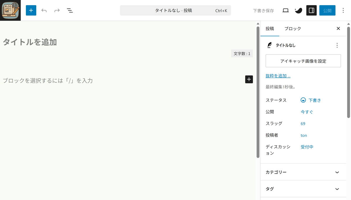 記事編集画面(ブロックエディタ) が表示されます