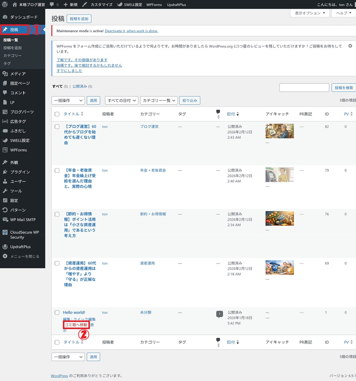 ② 「ゴミ箱へ移動」をクリック