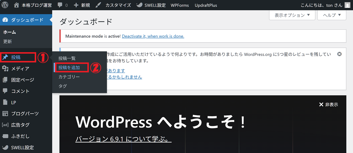 ② 「投稿を追加」をクリック