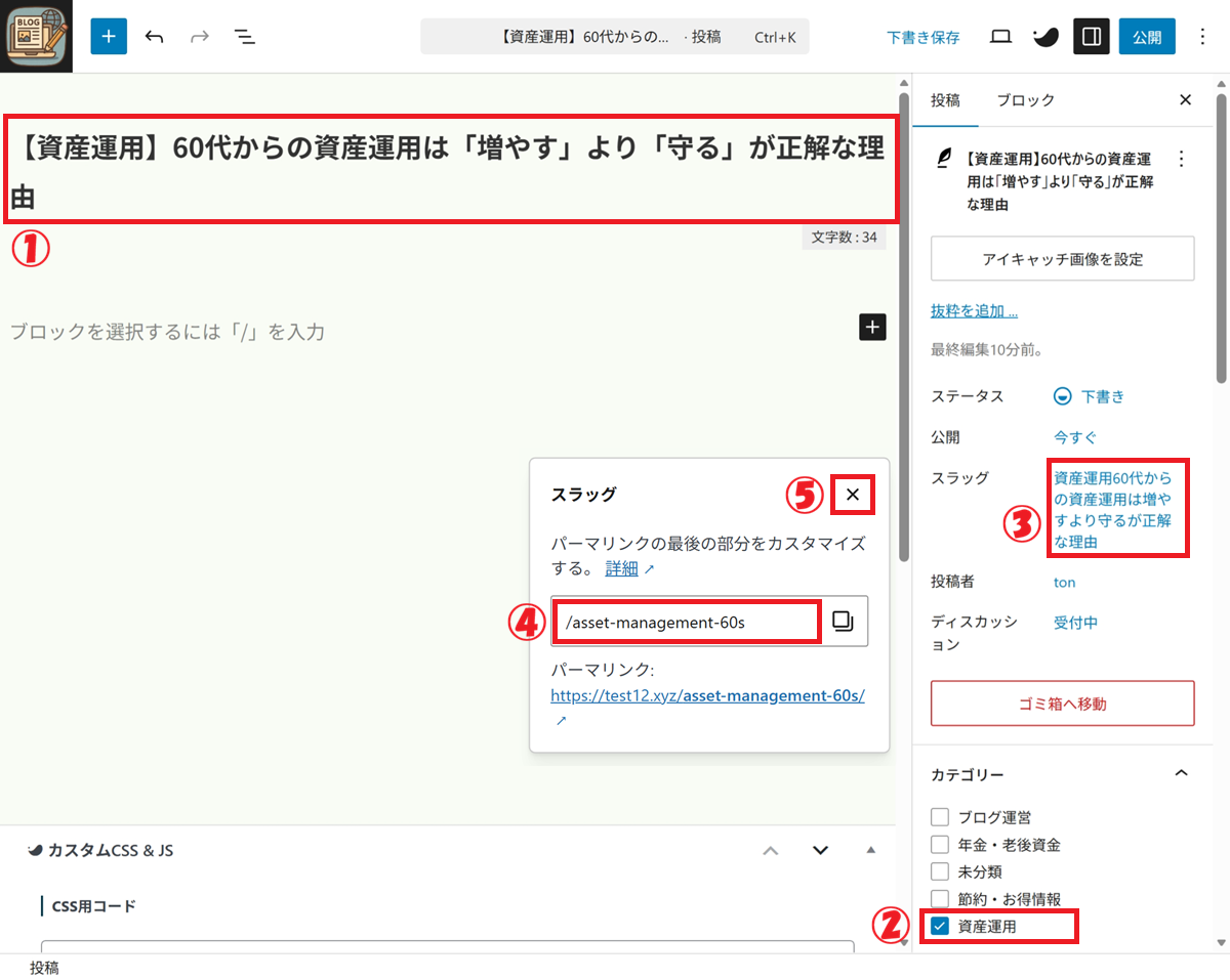 ④ スラッグはURLの一部を構成する要素なので、英数字に変更