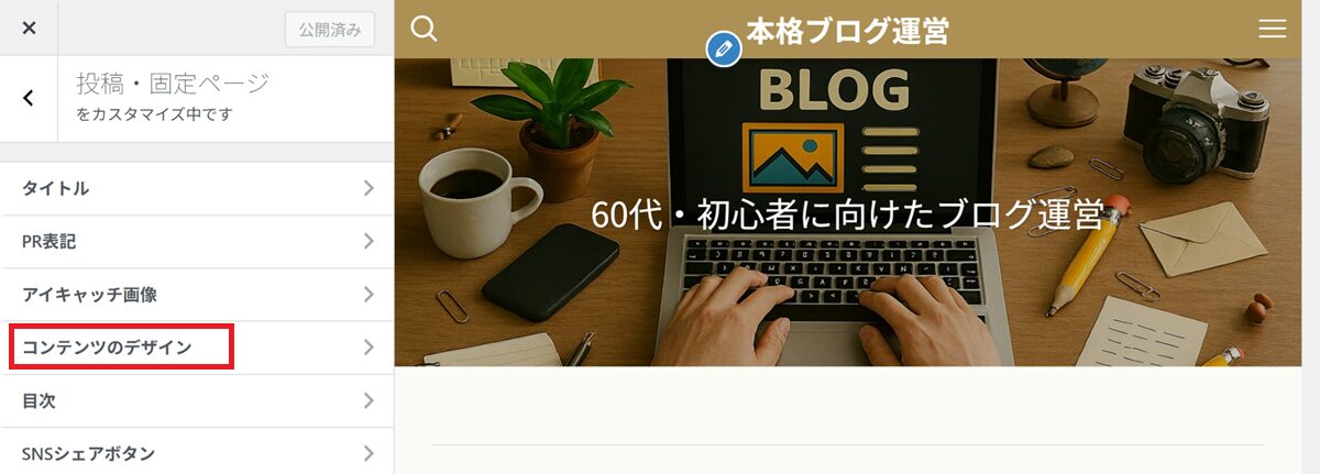 コンテンツのデザイン をクリック