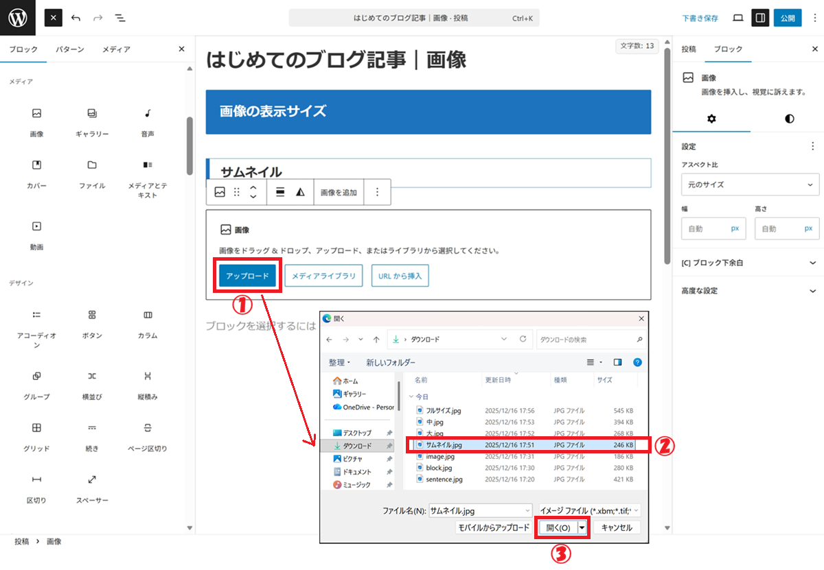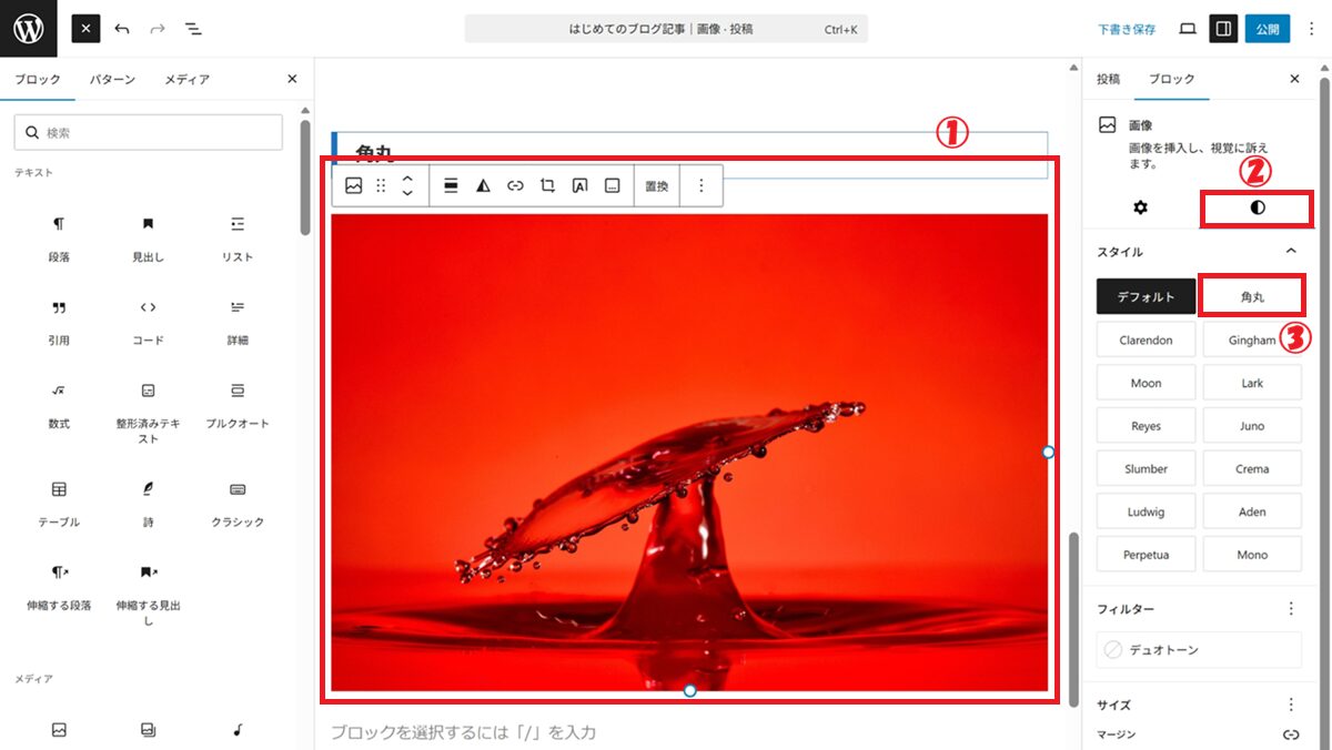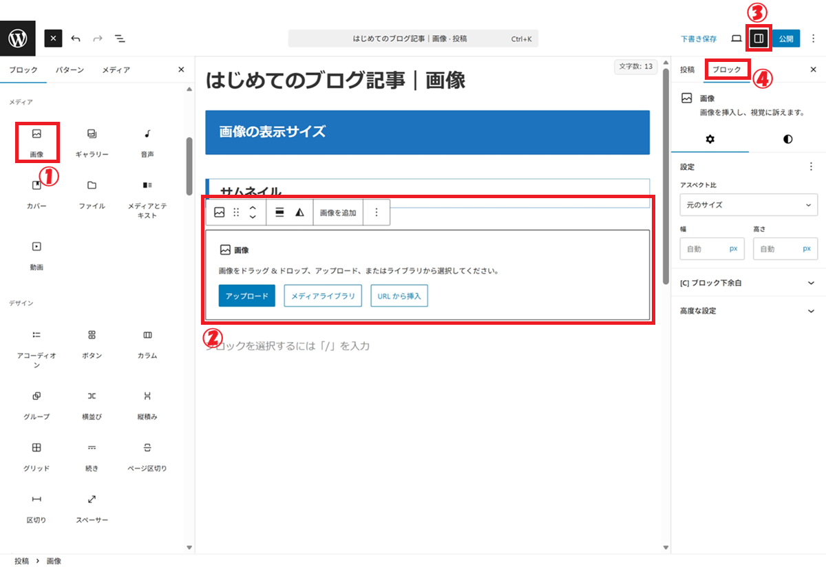 ③ サイドバー(投稿やブロックなど)が表示されていなければクリック