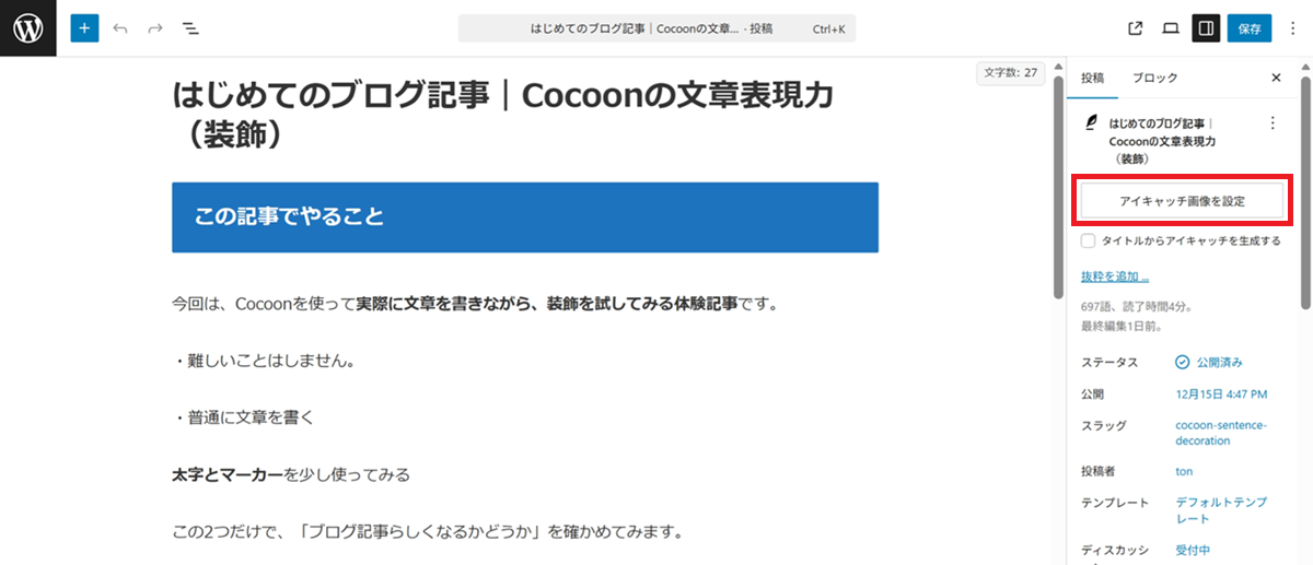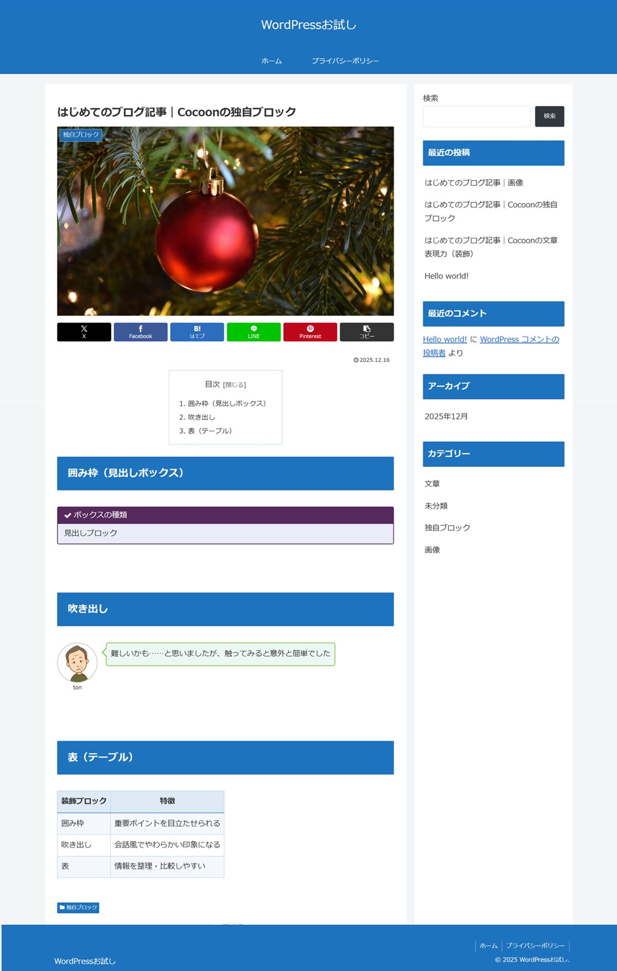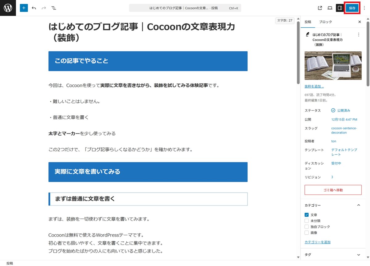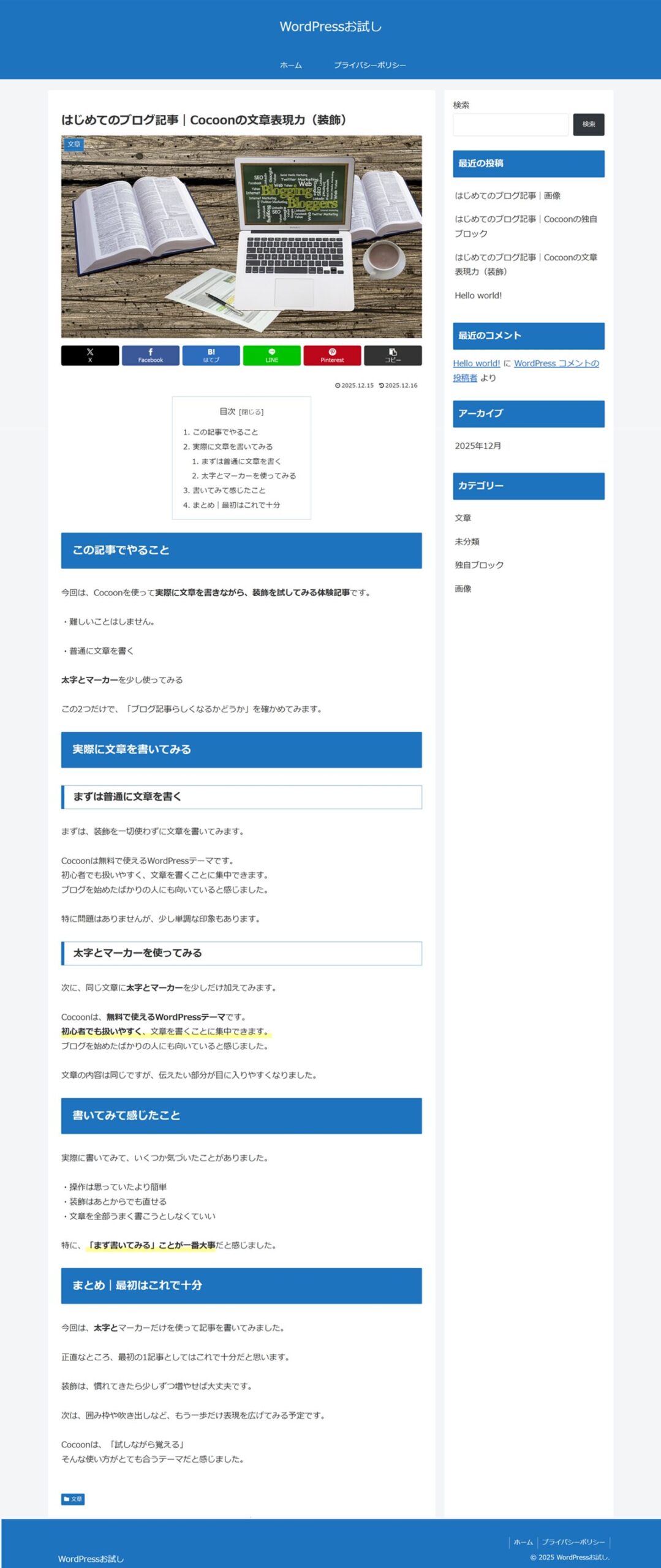 はじめてのブログ記事|Cocoonの文章表現力(装飾)