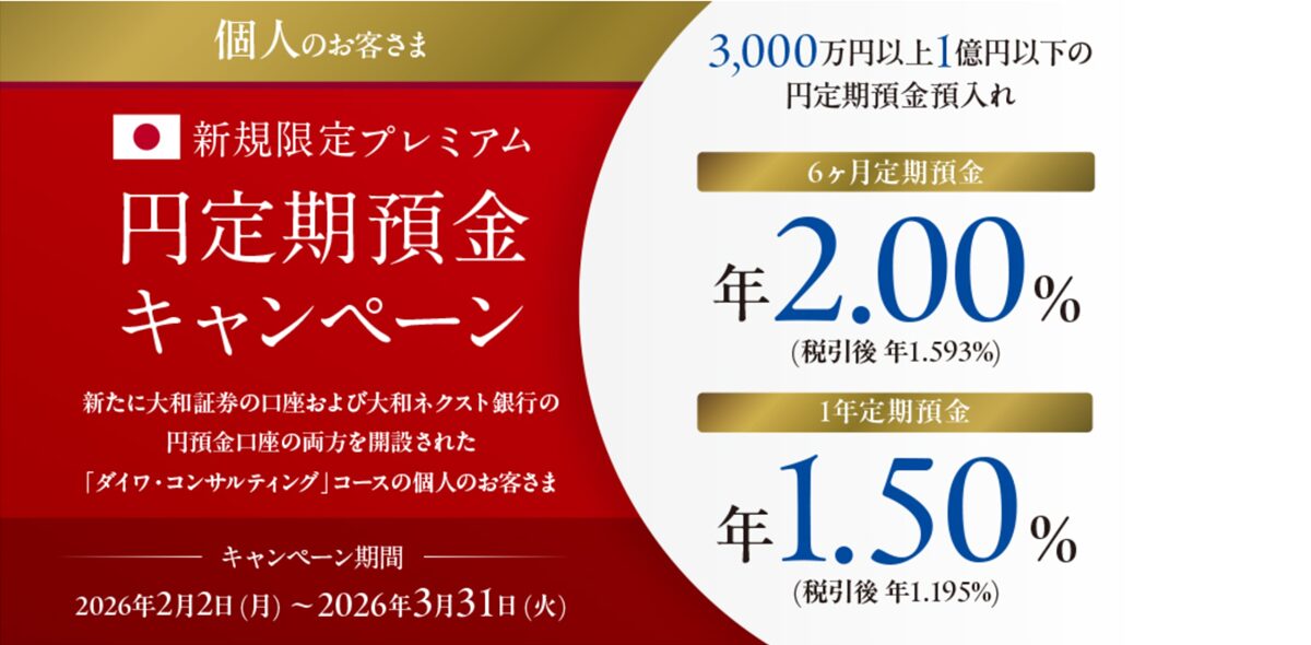 大和ネクスト銀行では、新規口座開設者を対象に、3,000万円以上の預け入れで利用できる円定期預金キャンペーンが実施されています。