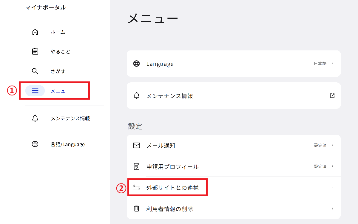 ①「メニュー」 → ②「外部サイトとの連携」をクリック