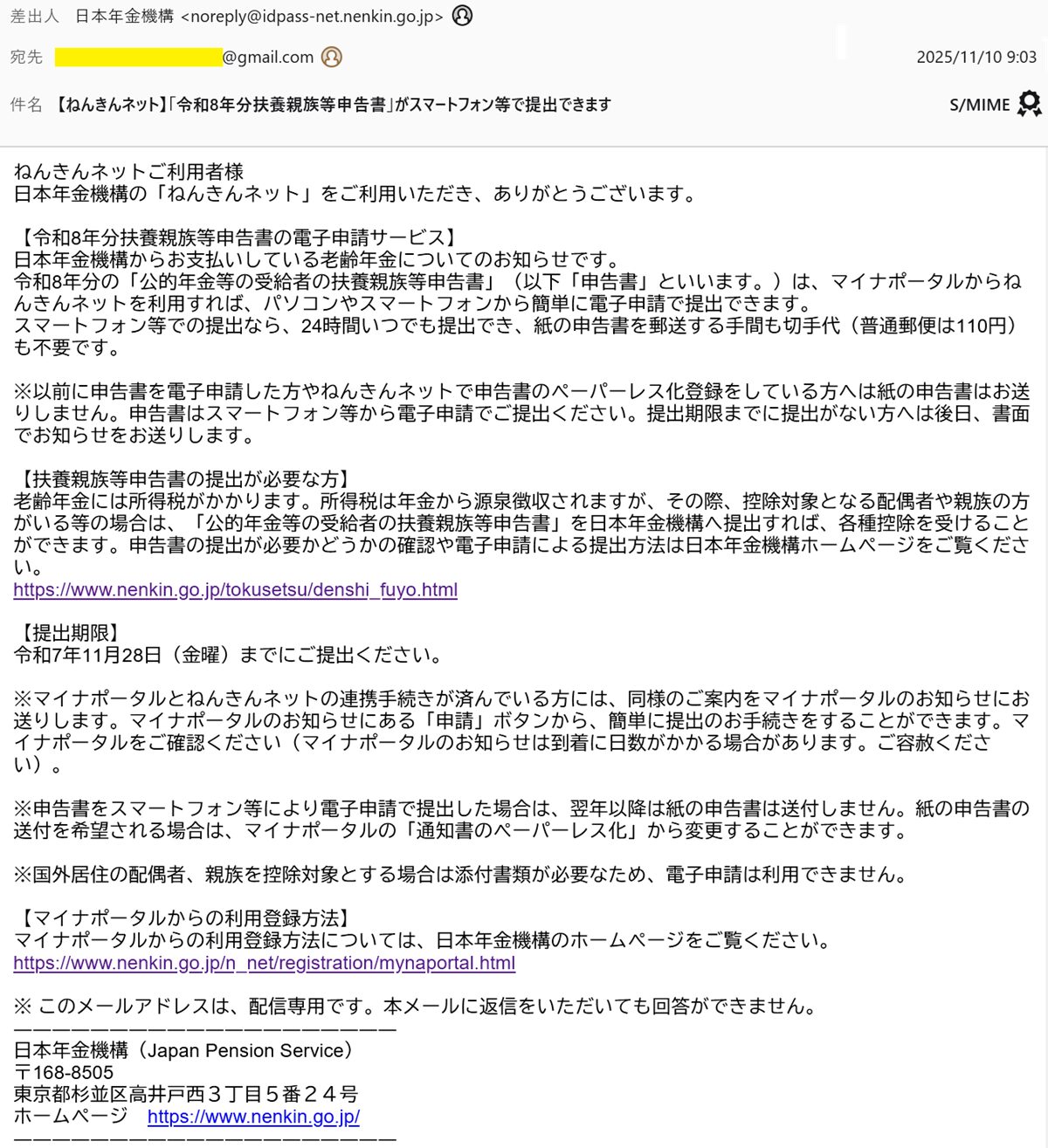 「これでいったん落ち着いたかな」と思っていたところ、今月(2025年11月)になって、日本年金機構から 「扶養親族等申告書」提出のお願い のメールが届きました。