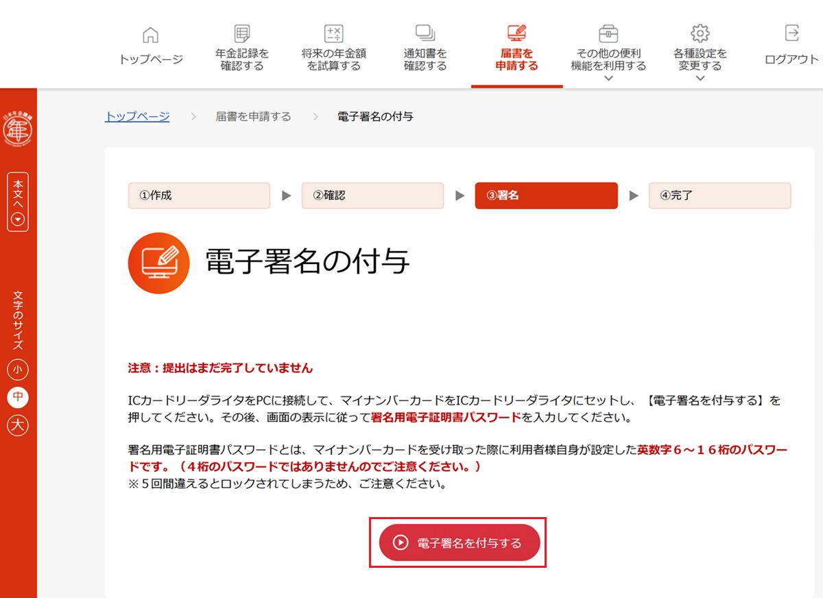 電子署名を付与するをクリックし、「署名用電子証明書パスワード」を入力