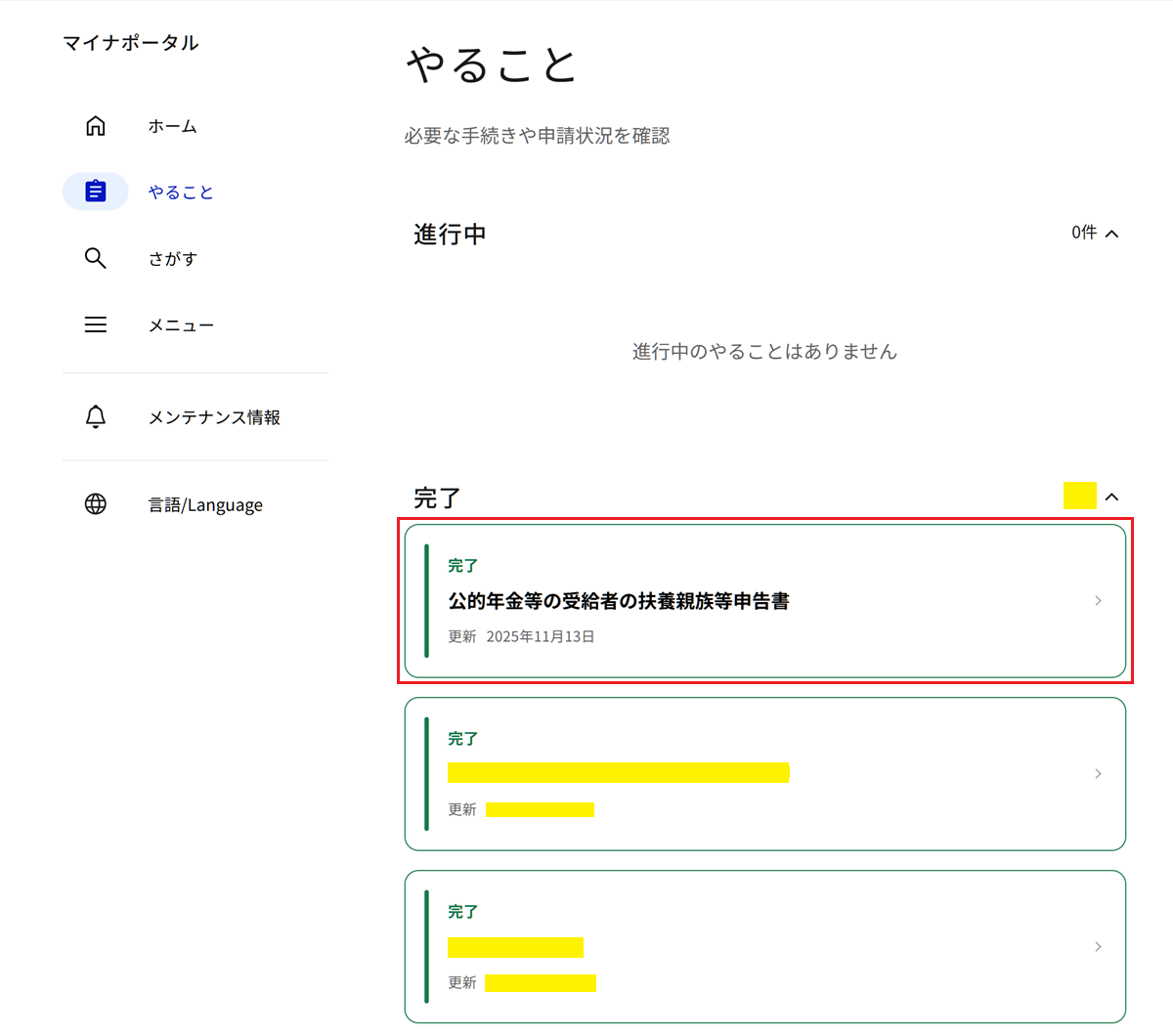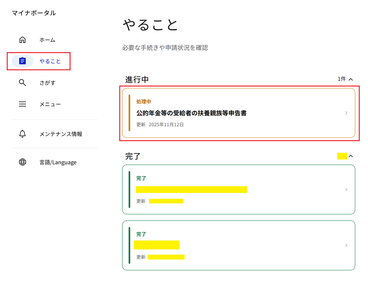 提出後は、マイナポータルの 「やること」メニュー から進捗状況を確認することができます。