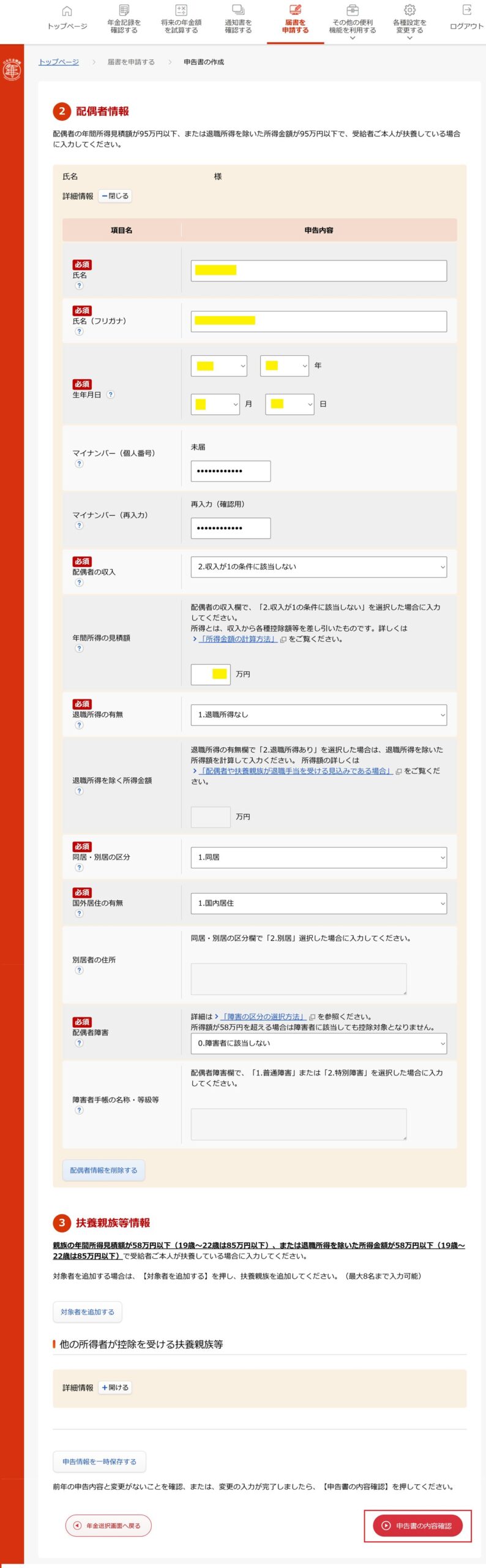❷配偶者情報欄の必要項目 を入力し、申告書の内容確認 をクリック