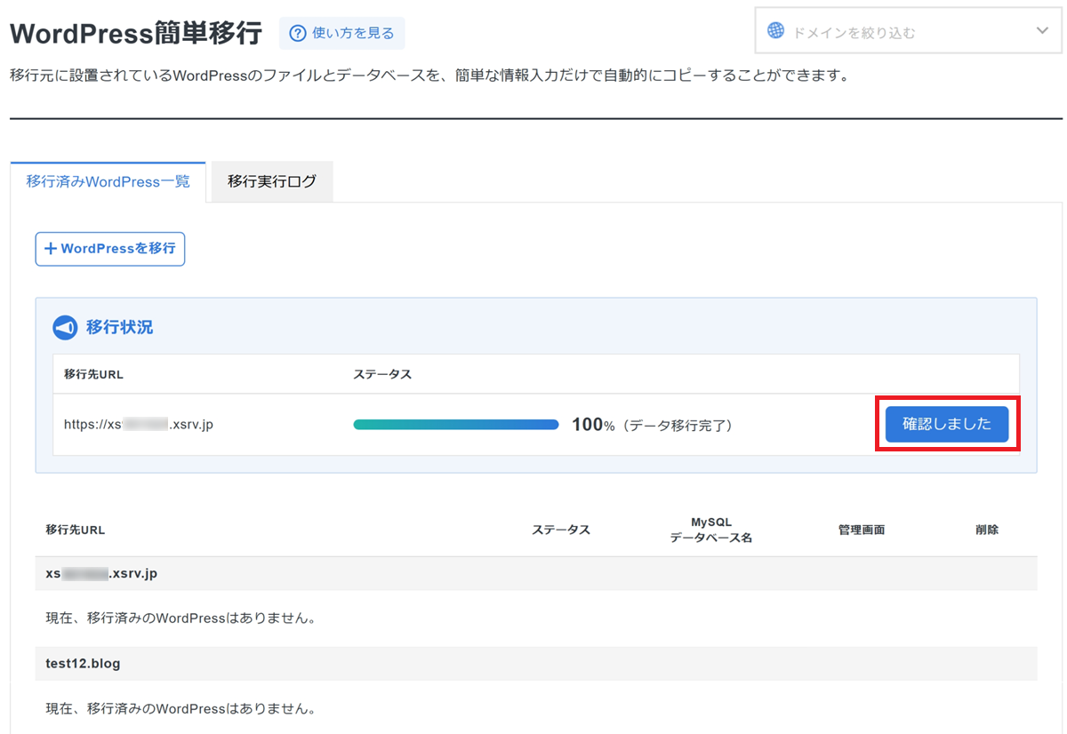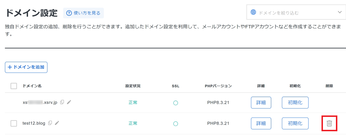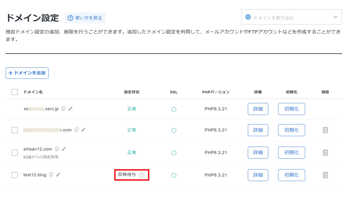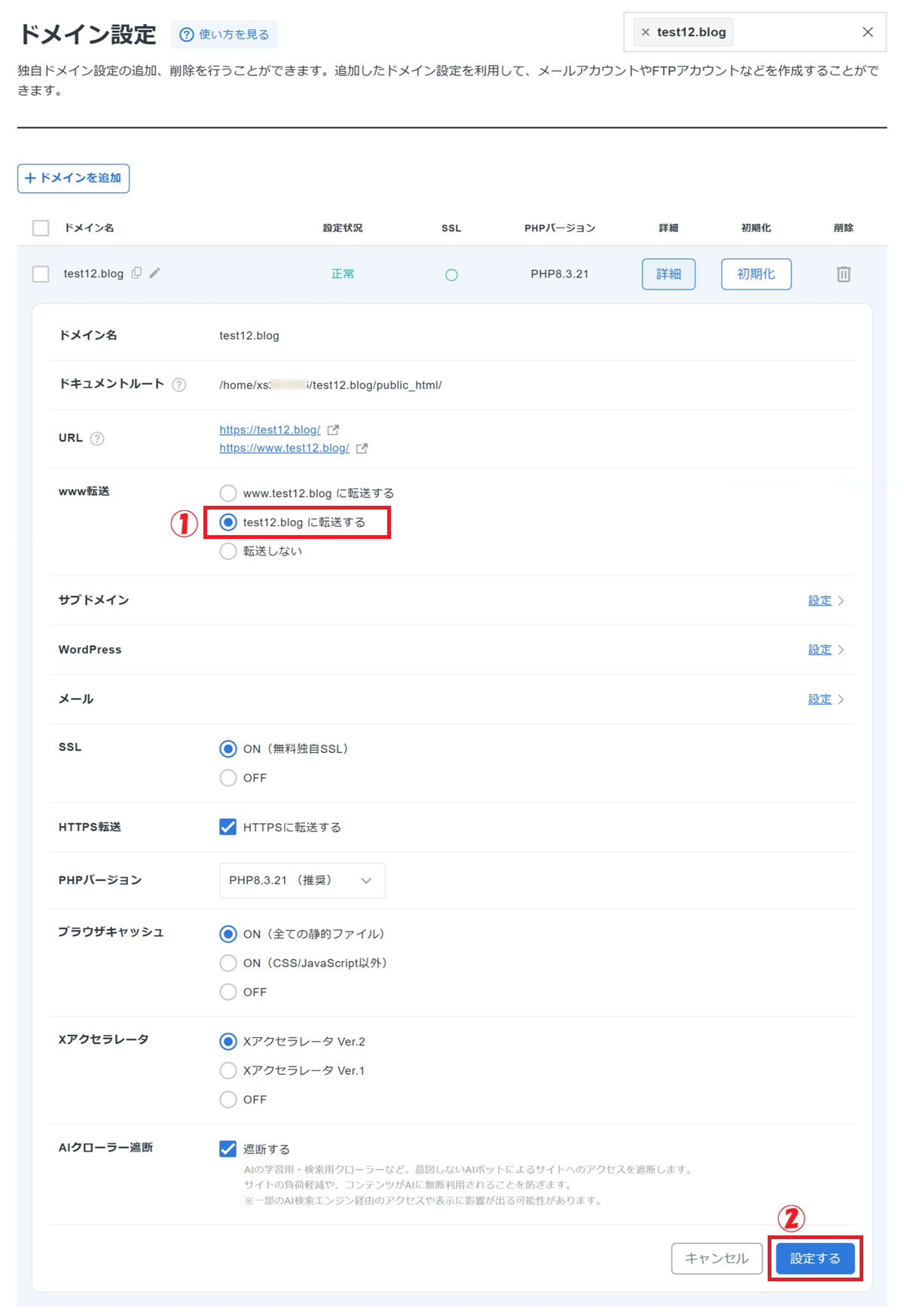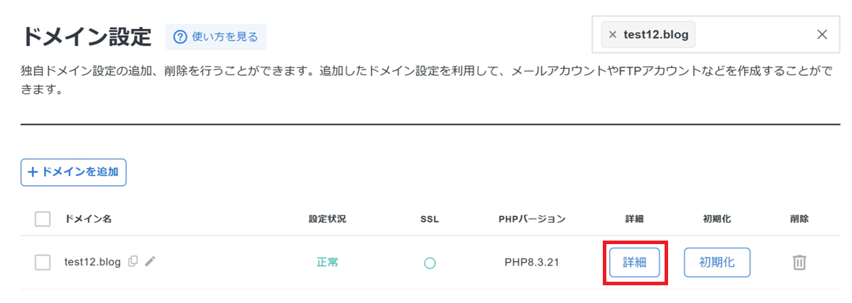 移行先サーバーにて譲渡したいドメイン」(test12.blog )の再設定を行ないます。