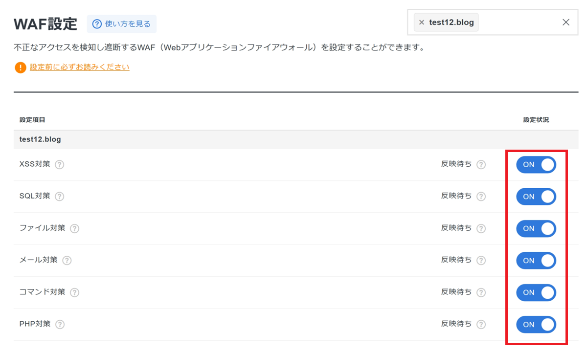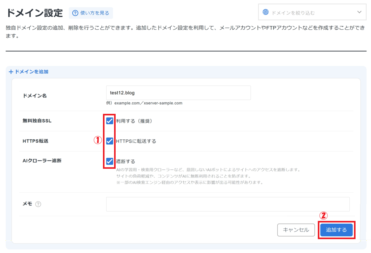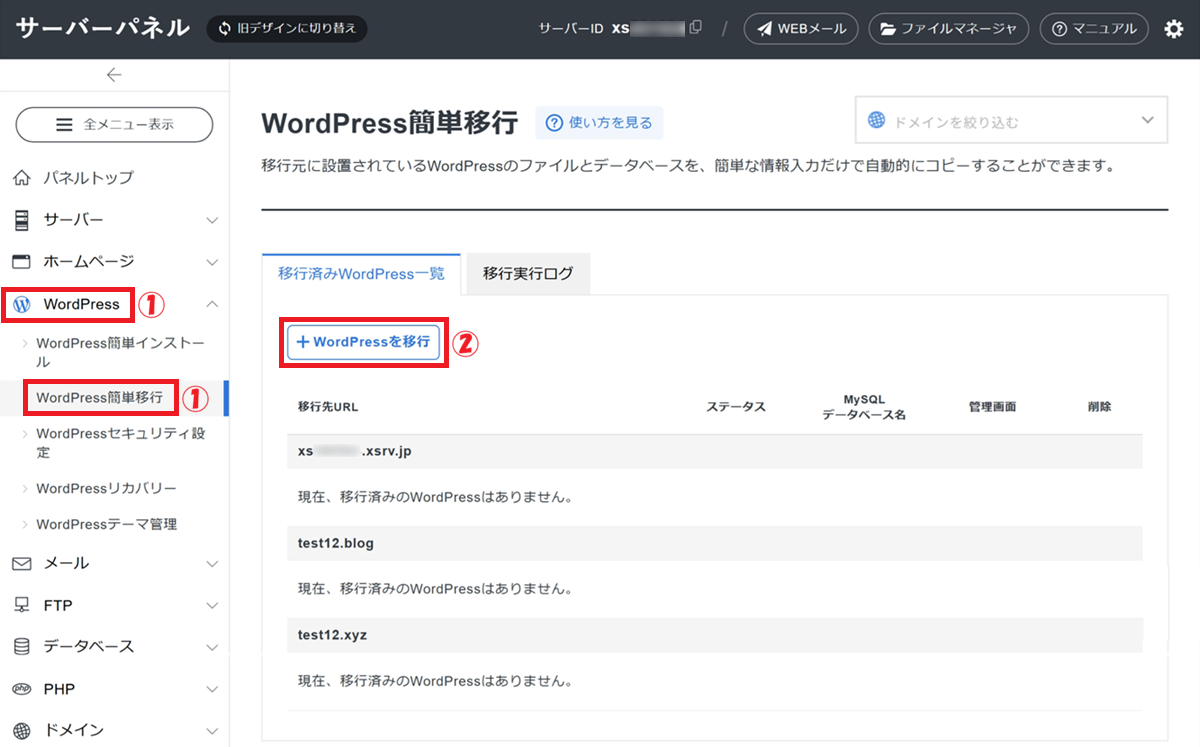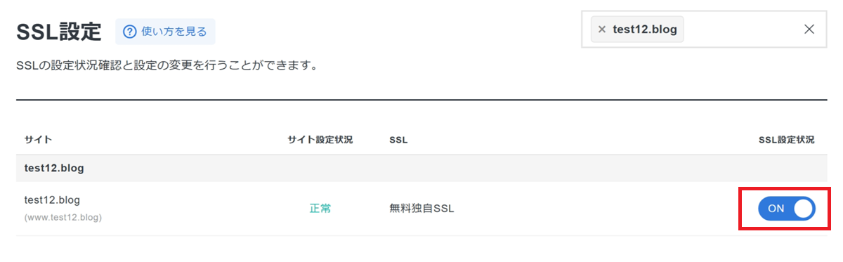 移行先サーバーにて譲渡したいドメイン」(test12.blog )の再設定を行ないます。