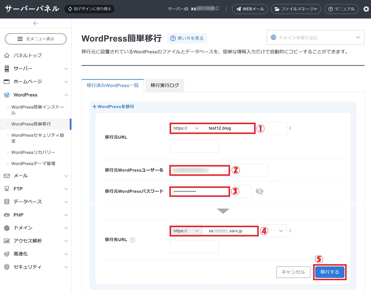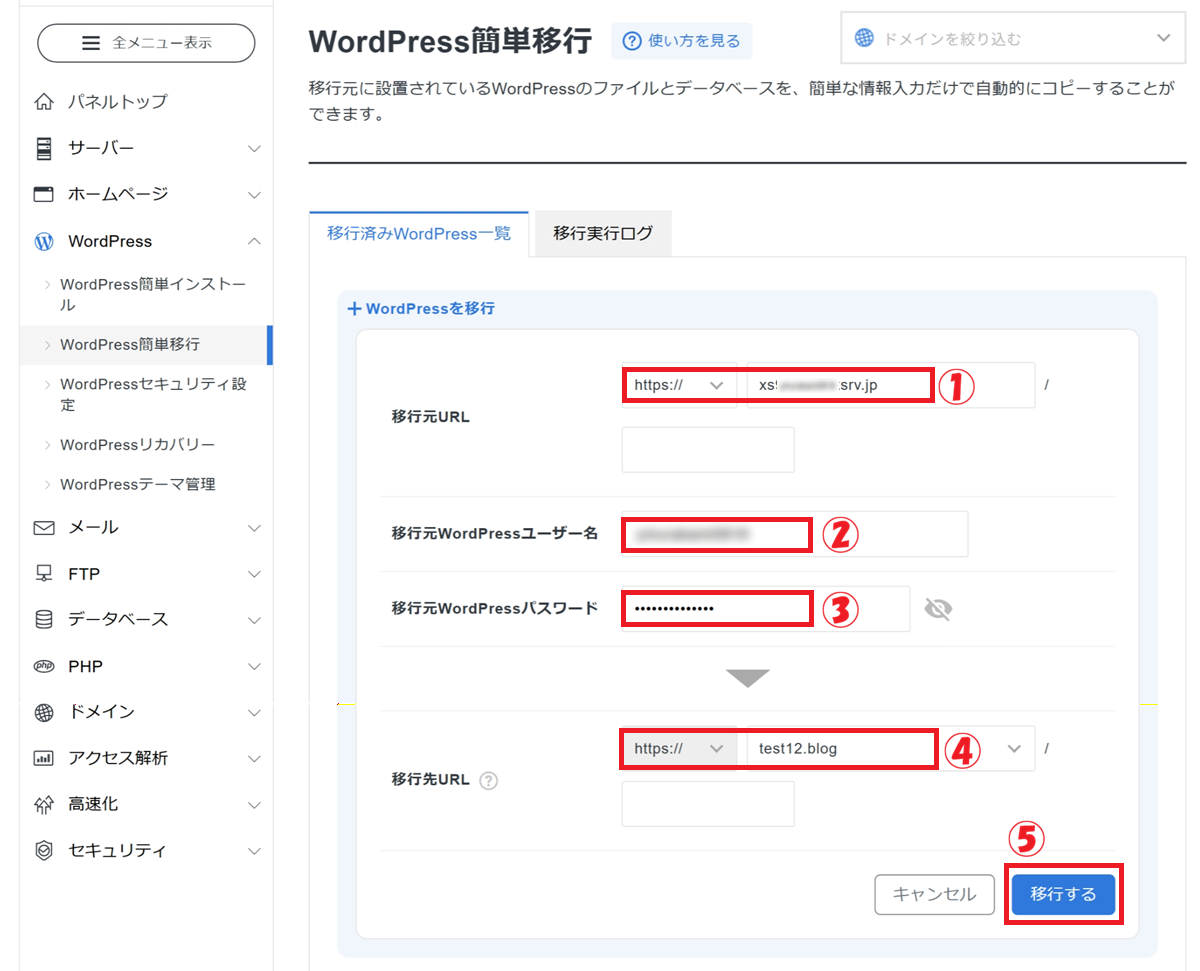 移行先サーバー譲渡したいドメイン」(test12.blog )を登録します。