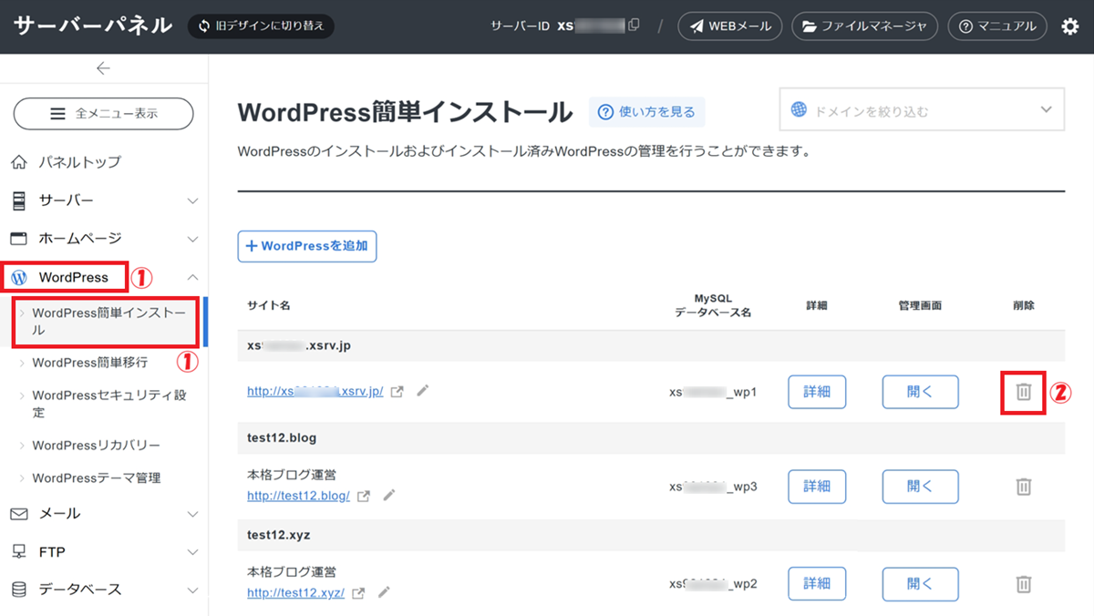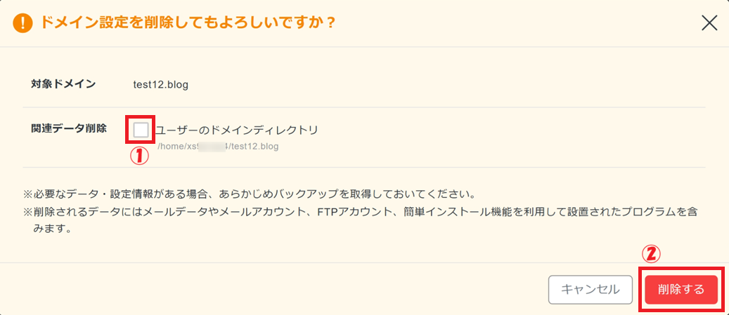 移行元サーバーにある譲渡したいドメイン」(test12.blog )を削除します。