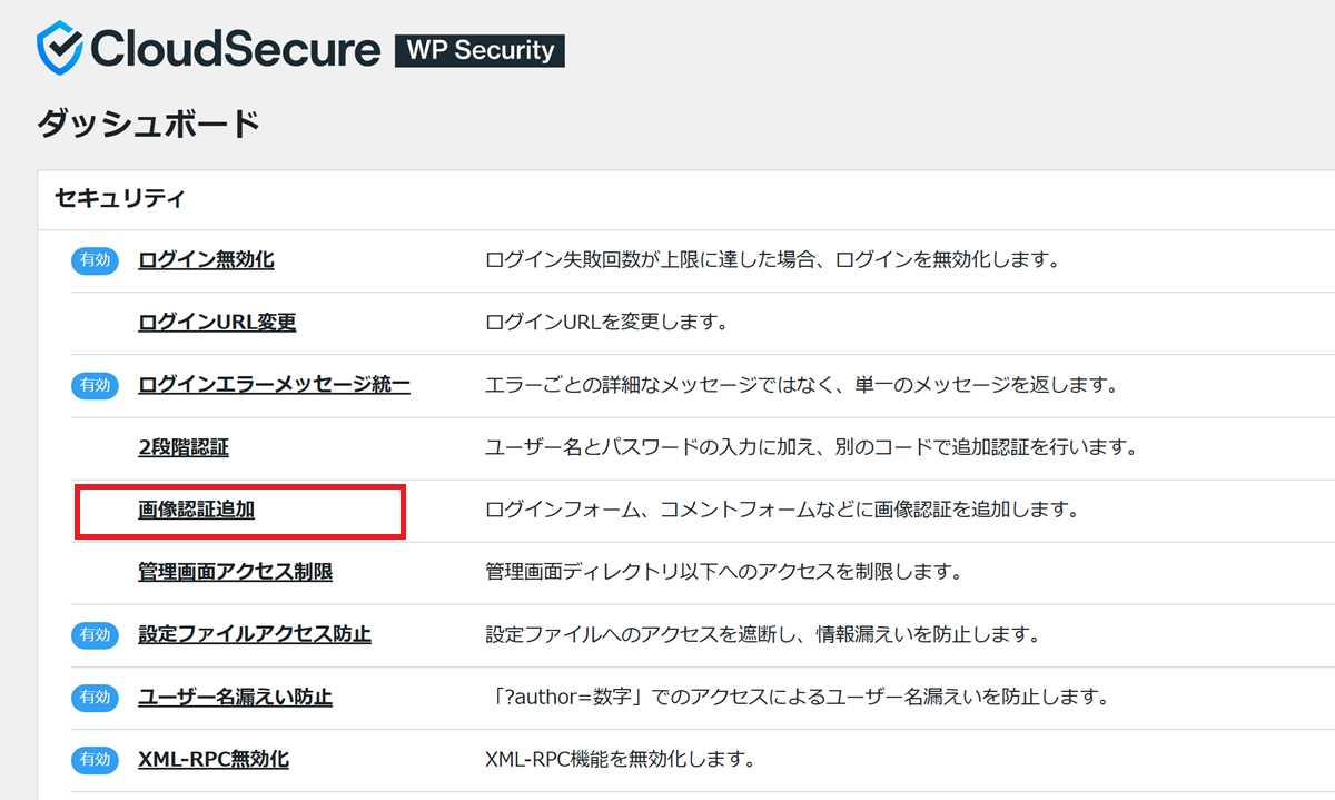 CloudSecure WP Security は、 インストールした時点で 最低限の安全対策(8項目)がすでに有効になっています。