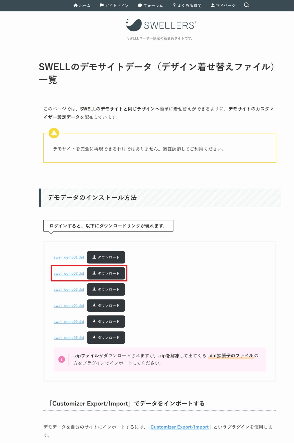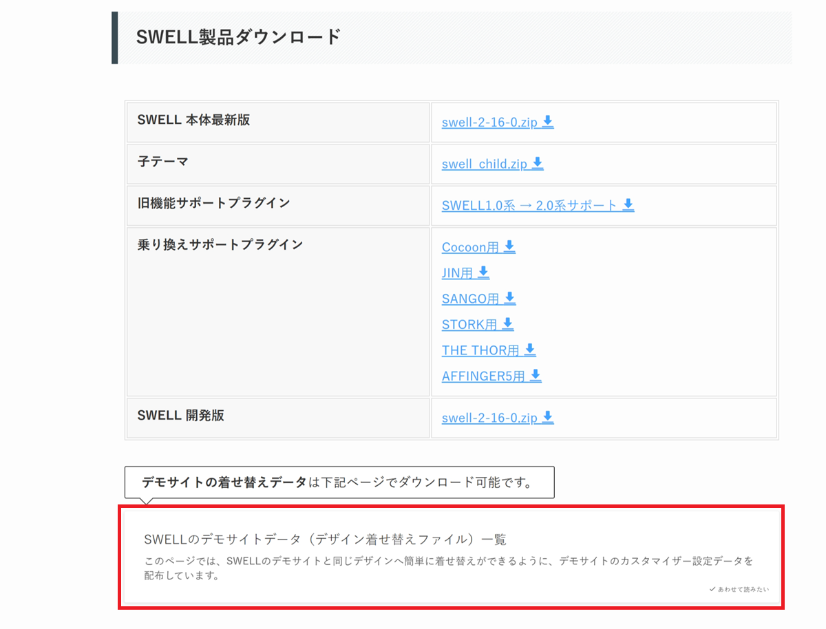 画面を下にスクロールして「SWELLのデモサイトデータ一覧」をクリック