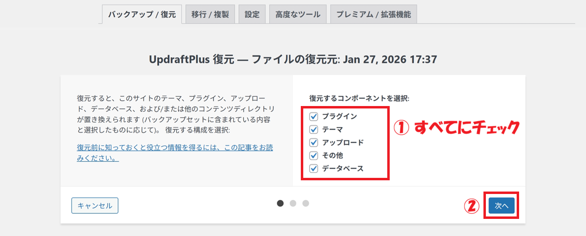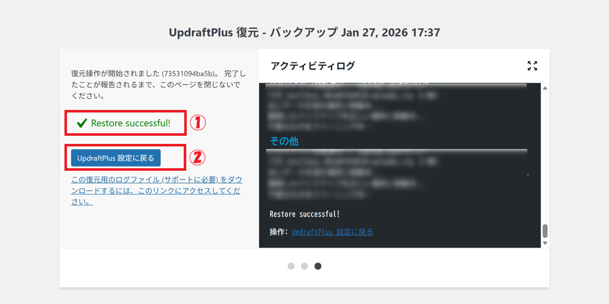 ② UpdraftPlus設定に戻る をクリック