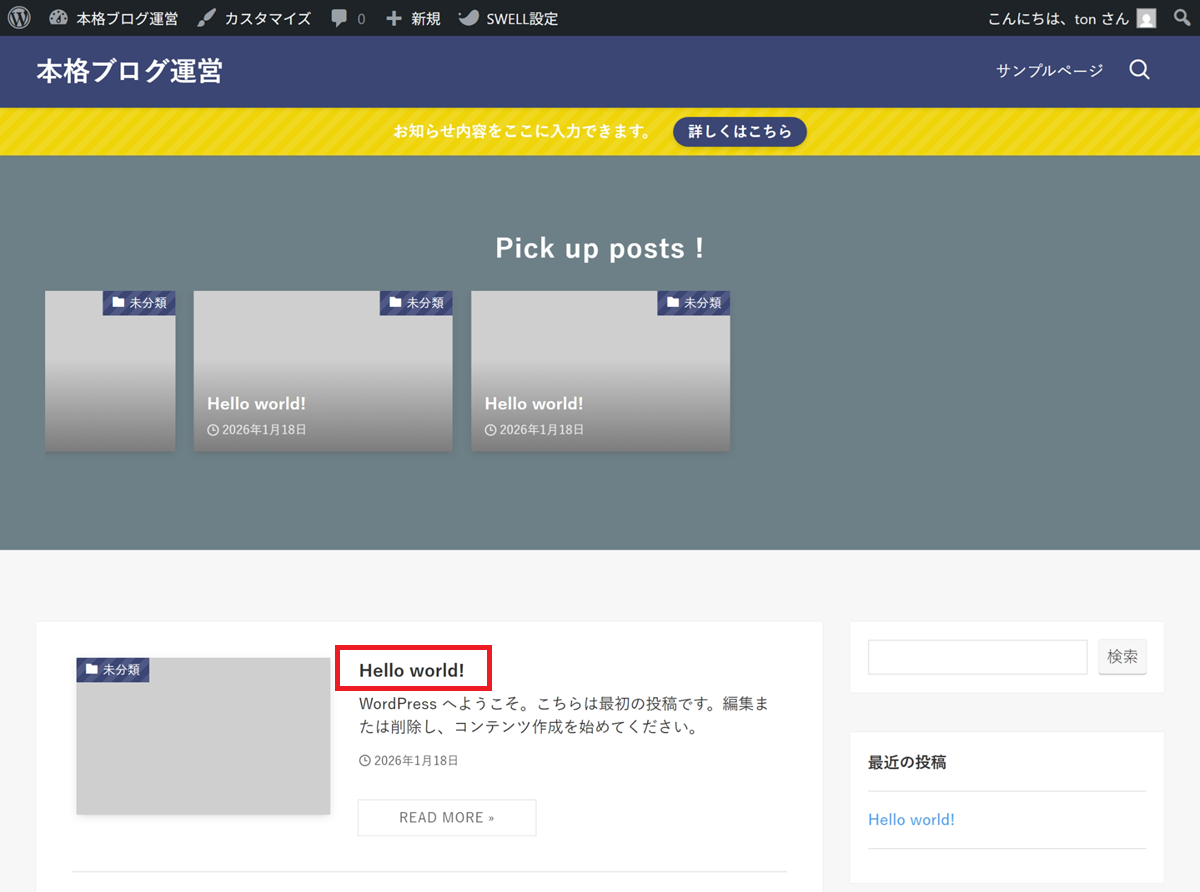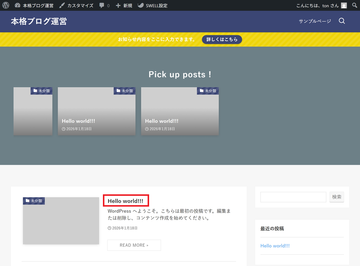 2.記事タイトルを変更(Hello world! → Hello world!!!)