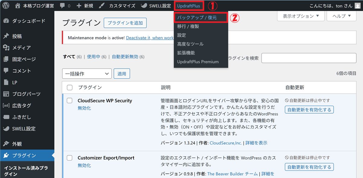 ① UpdraftPlus をクリック