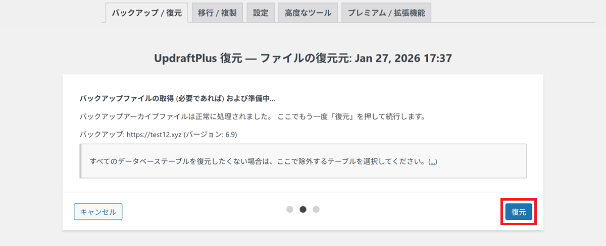 バックアップ一覧の 復元 をクリック