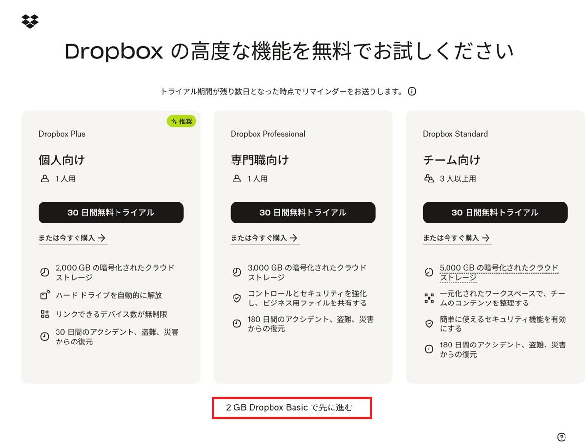 「2GB Dropbox Basic で先に進む」をクリック