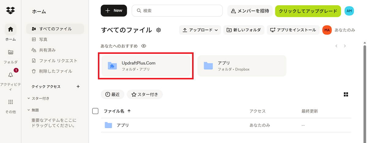 Dropboxのホーム画面(https://www.dropbox.com/home)が表示される