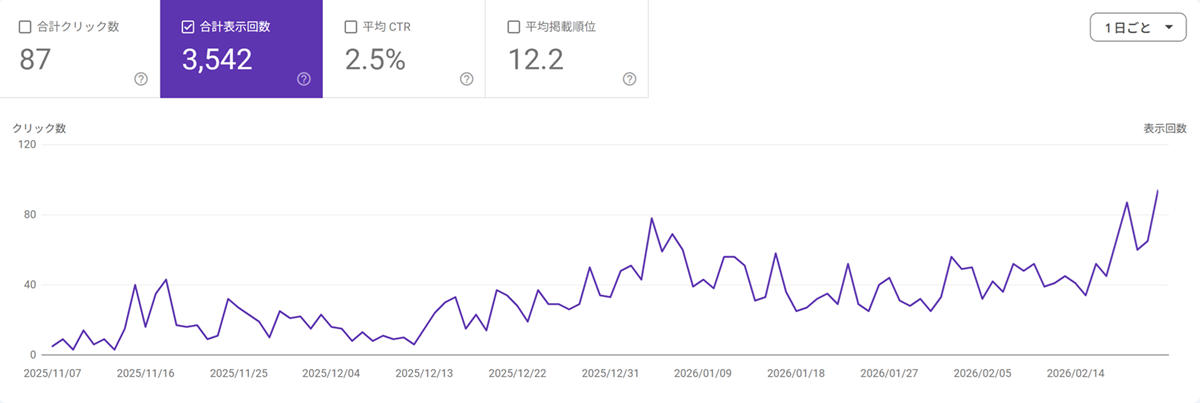 サーチコンソールの「検索パフォーマンス」を見ると、開設直後(2025年11月頃)は、1日の表示回数が1桁でした。