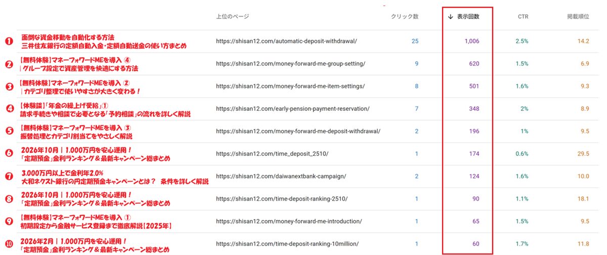 表示回数は「1,006回」とダントツですが、掲載順位は「14.2位」です。