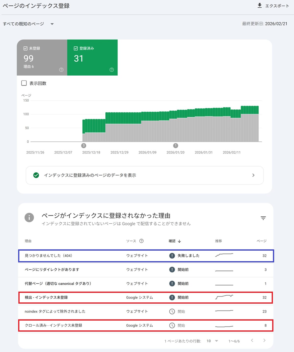 なんと、一生懸命書いたはずの記事が何十ページも、Googleの検索結果に登録(インデックス)されていない状態でした。