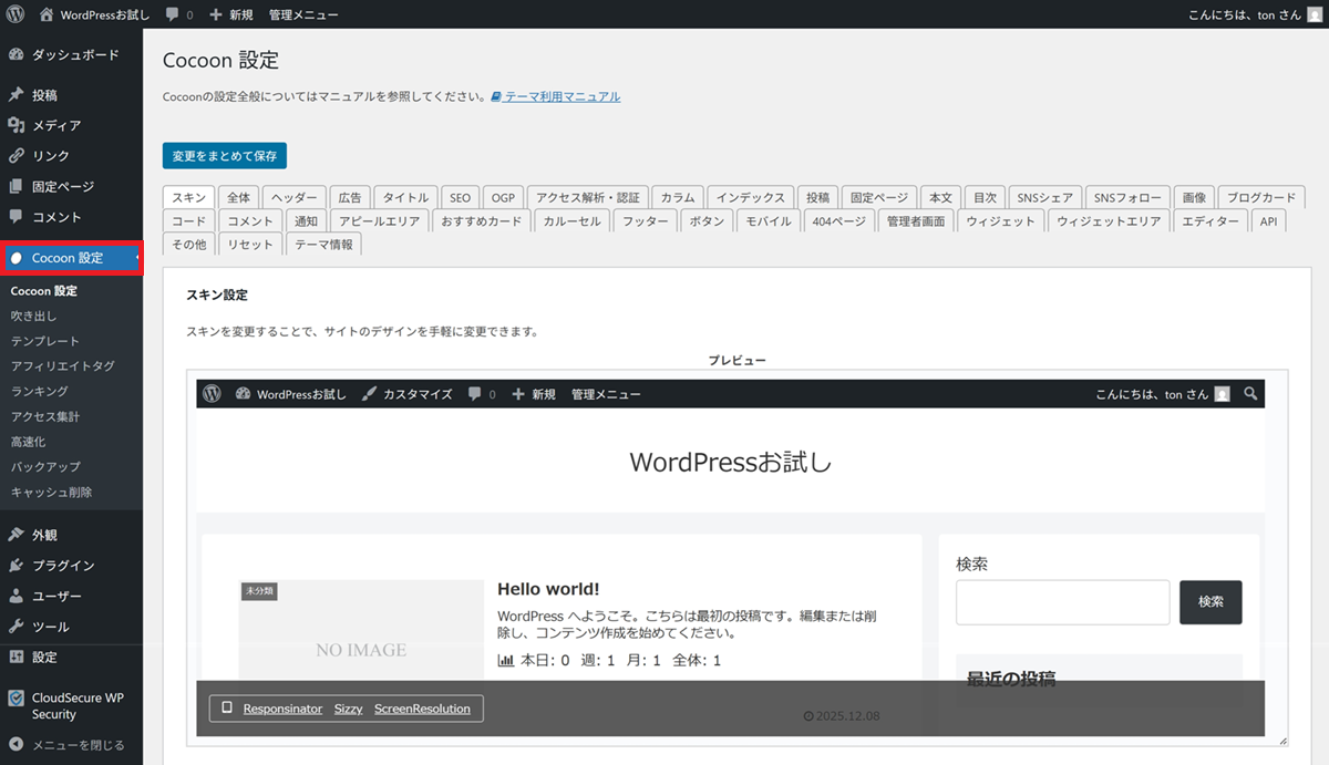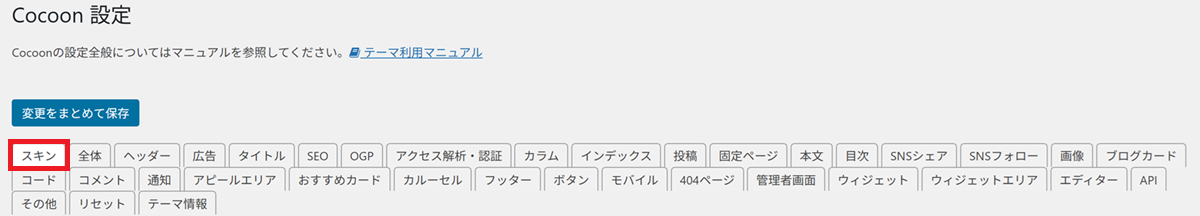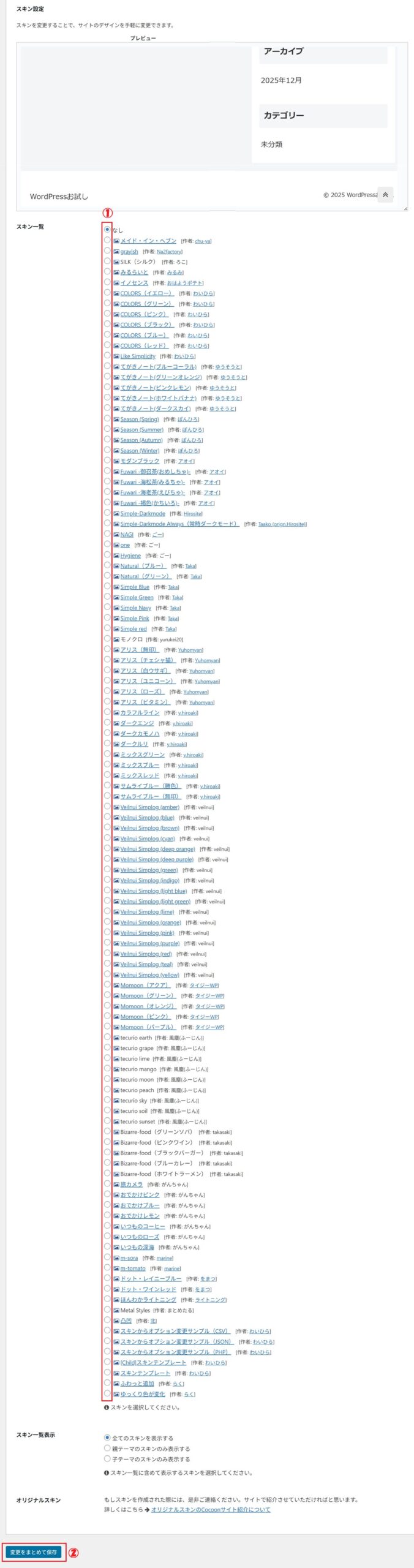 Cocoonには「着せ替え機能」があり、スキンを選ぶだけでブログの雰囲気が大きく変わります。