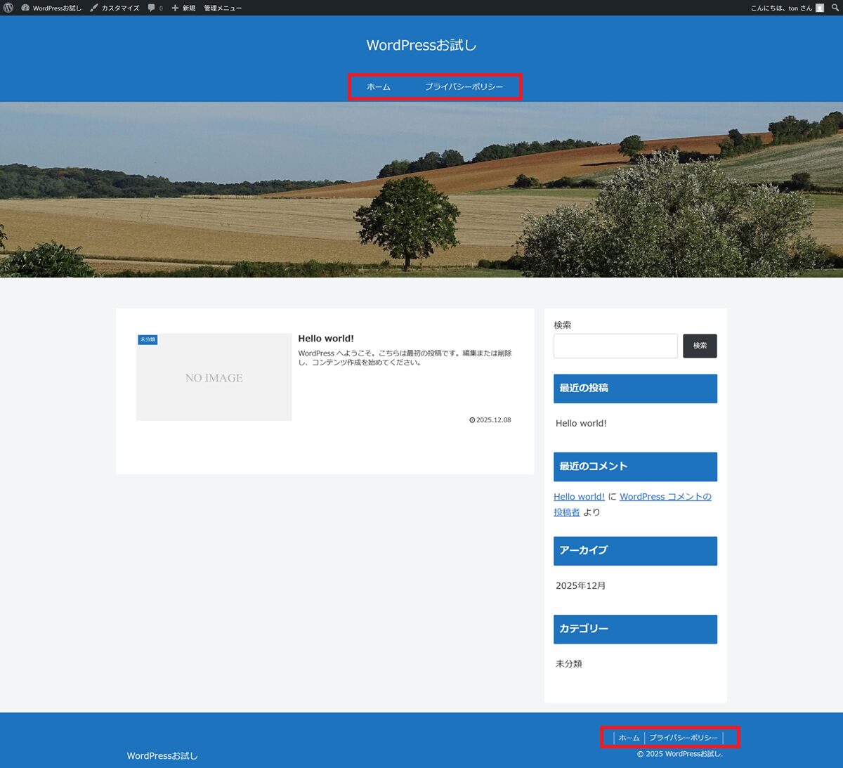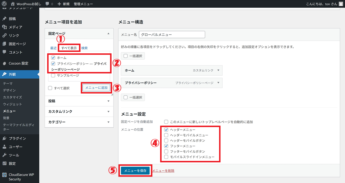 ④ 「ヘッダーメニュー」と「フッターメニュー」にチェックを入れる