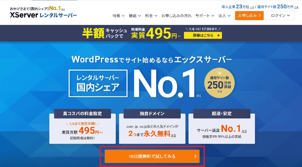 XServerの公式サイトを開き、10日間無料で試してみるをクリック