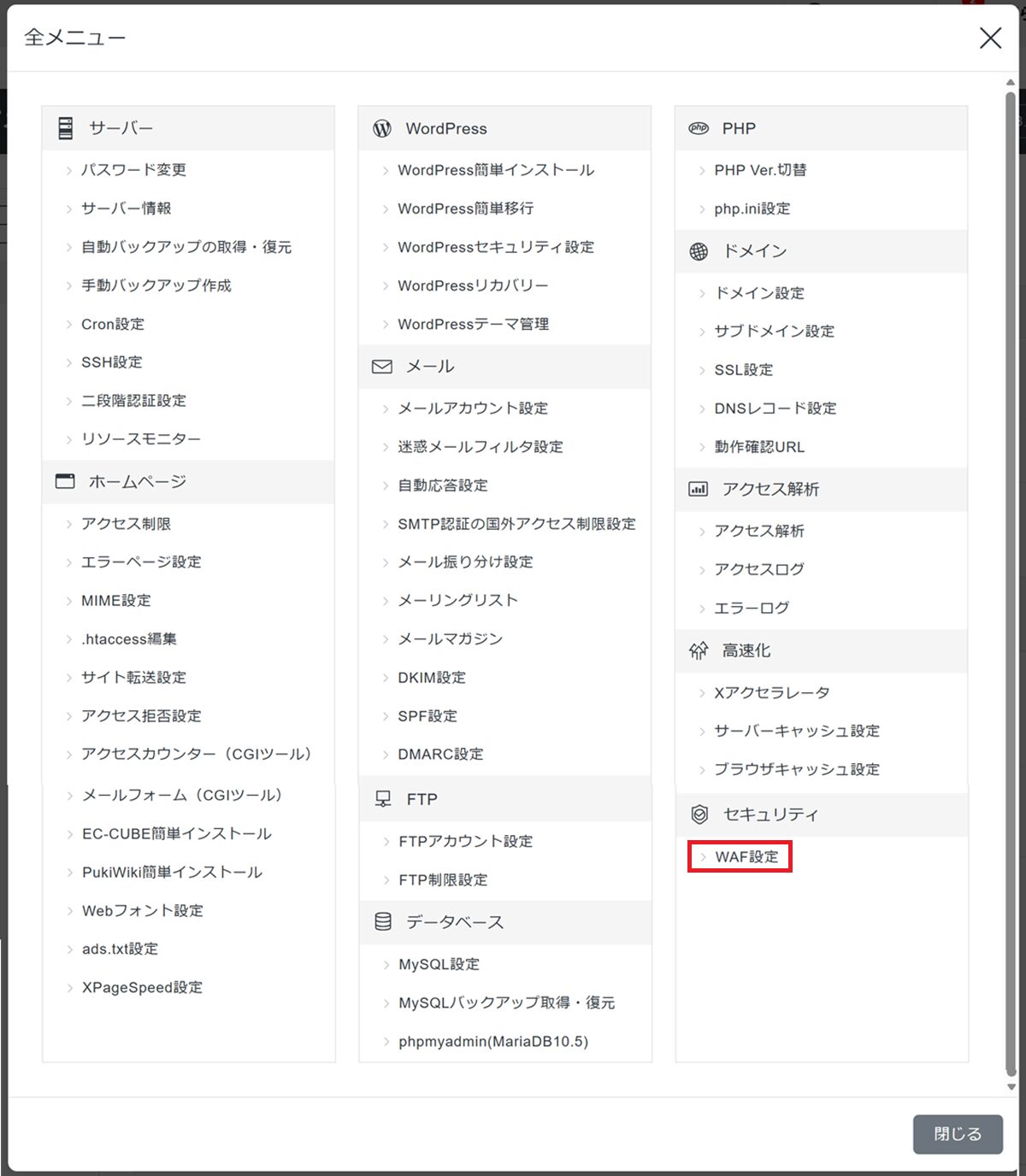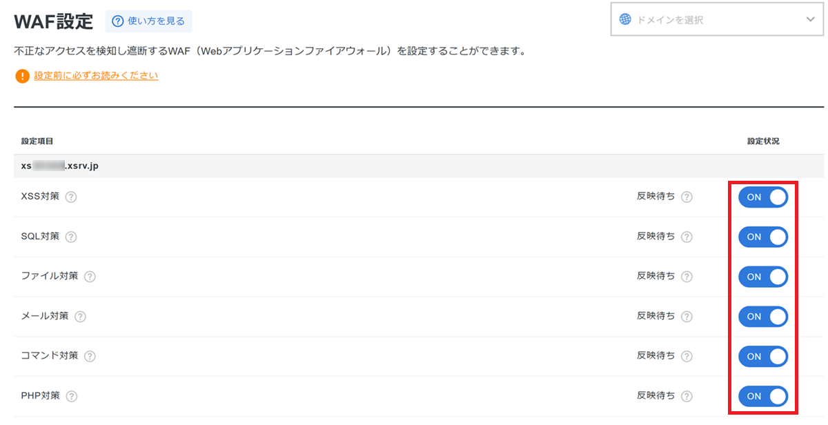 WAFを ON にするだけで、外部からの攻撃対策が強化されます。