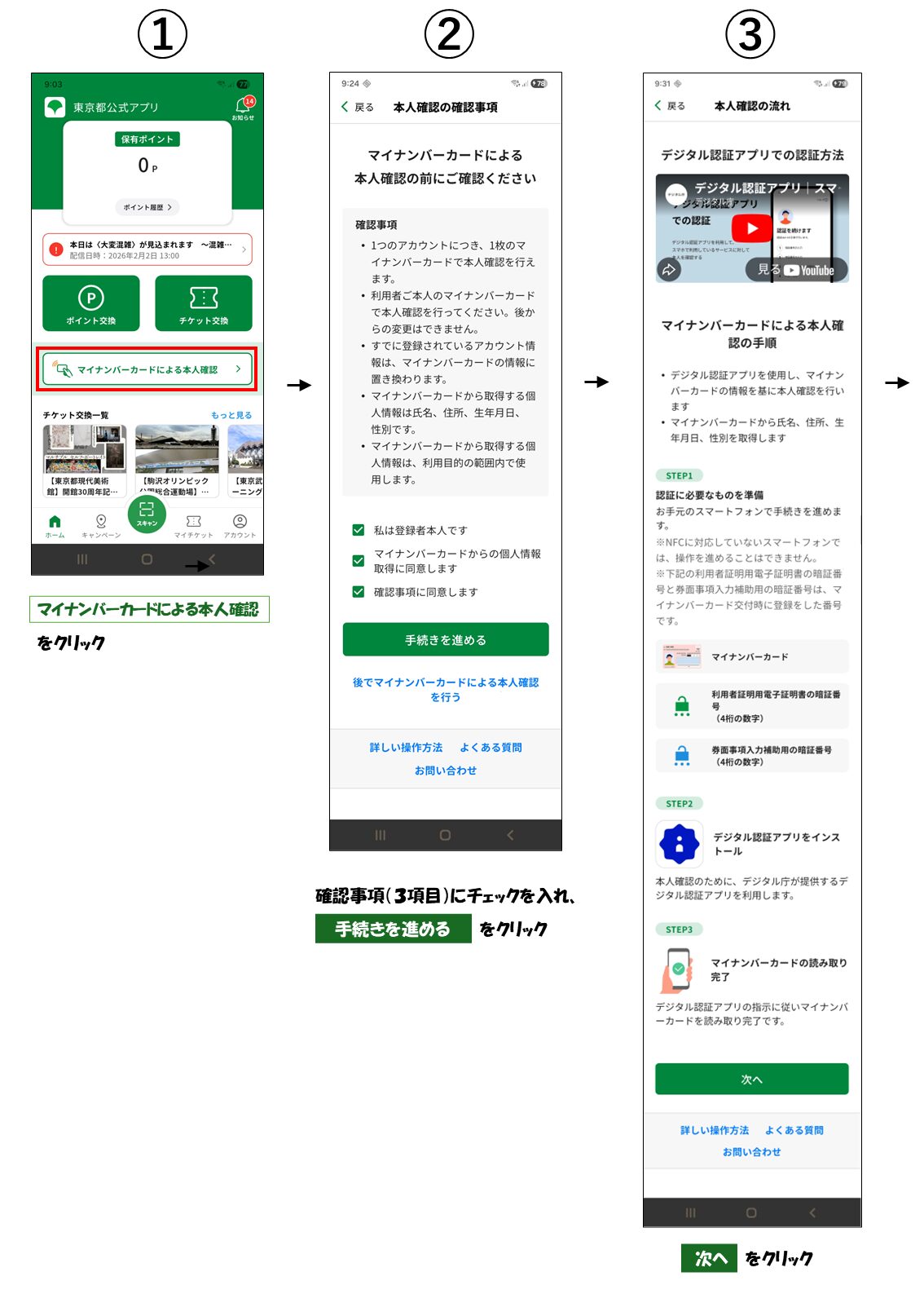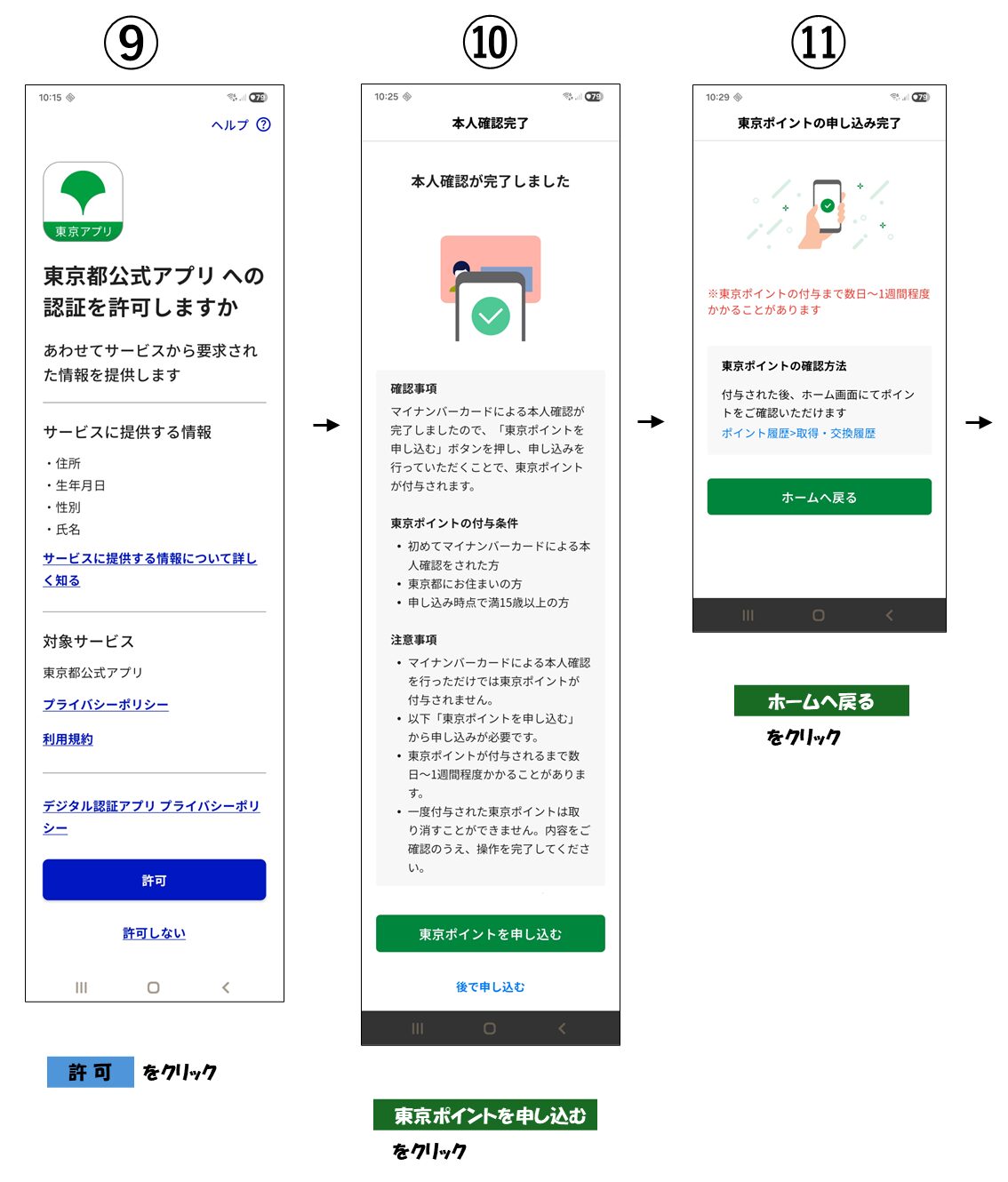 東京アプリ上で、以下の流れで操作します(①~⑪)。