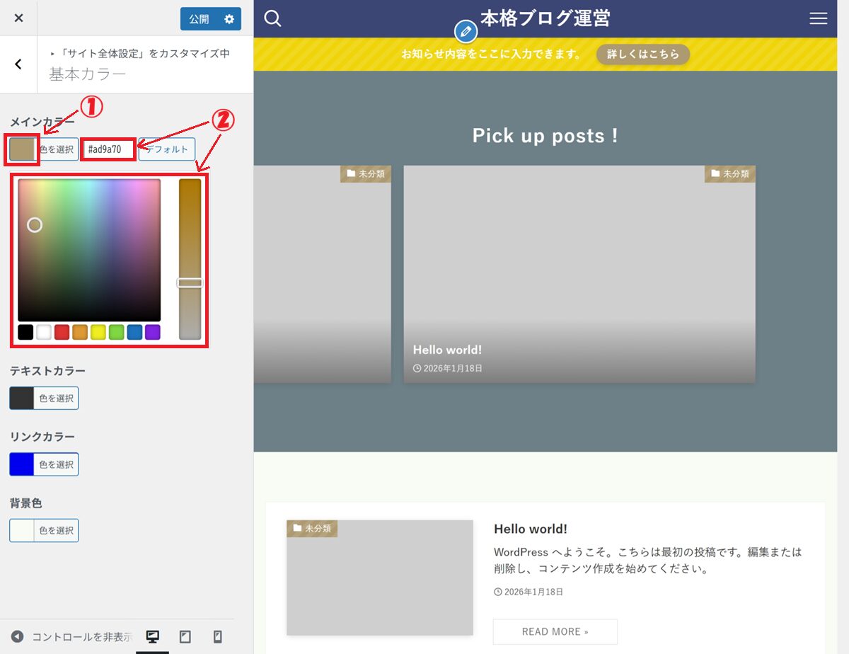 ① メインカラー の 色を選択 をクリック
