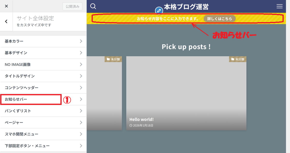 ① お知らせバー をクリック
